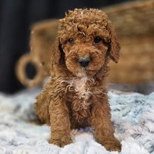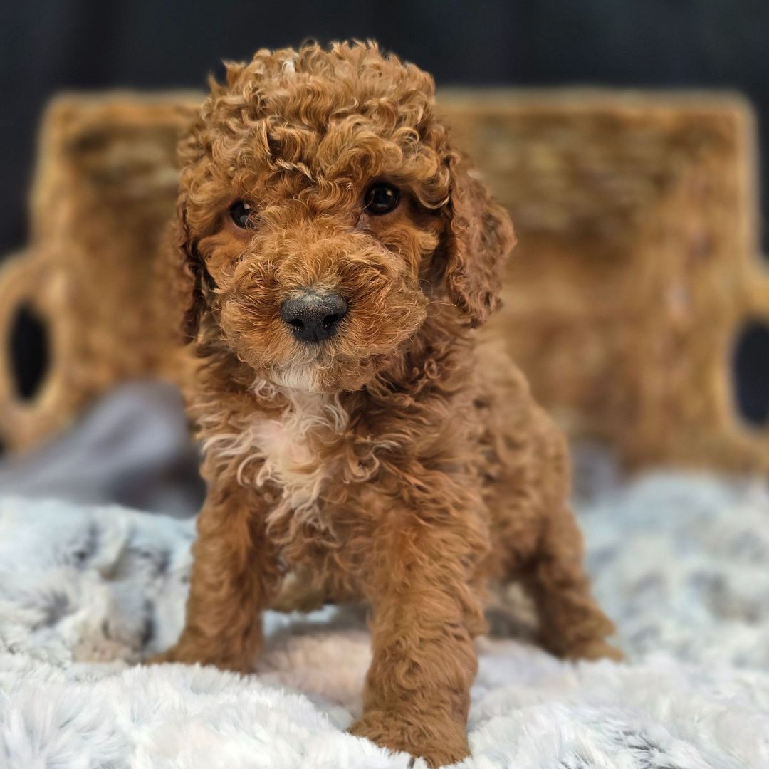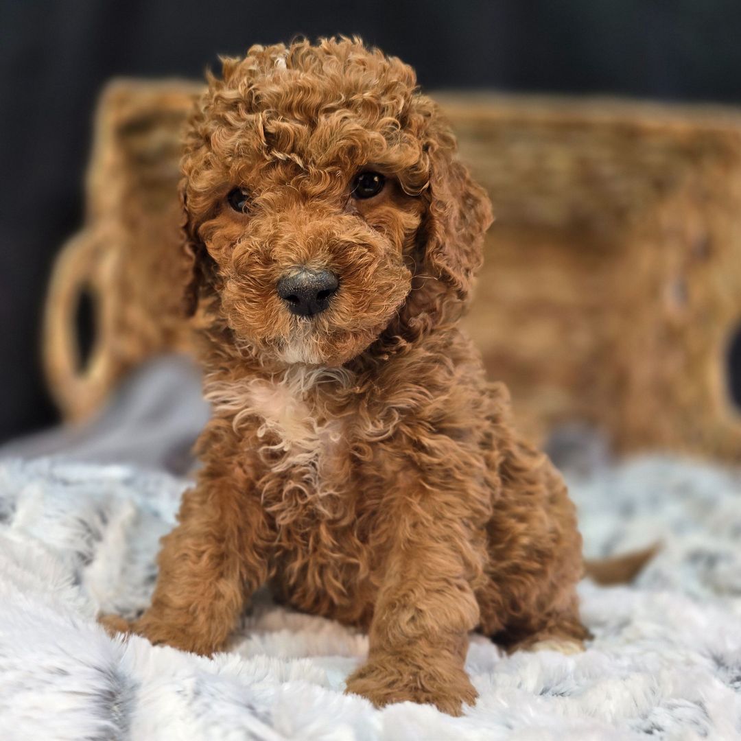 A beautiful red/apricot Goldendoodle girl with a soft curly coat and a gentle, curious personality. Raised with calm routines, early socialization, and thoughtful care. Available for a loving home, application required.