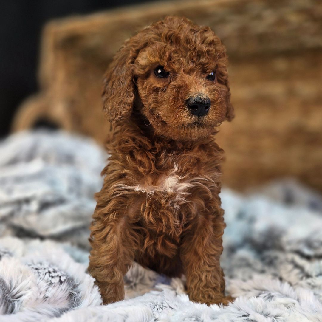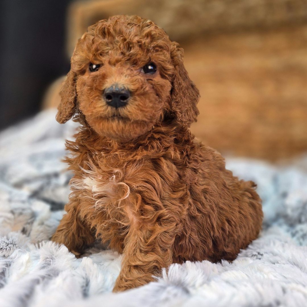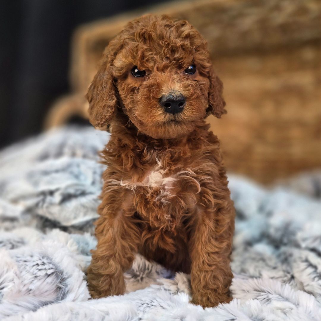 An adorable Goldendoodle boy with a rich red/apricot coat and soft curls,